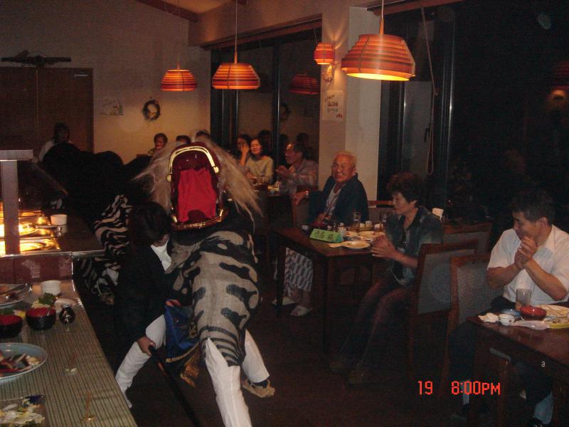 狭いレストランの通路で警護掛かりです。えくぼでは三通りの警護掛かりを稽古していまして、二回目の最後は飯豊近辺で見られるような獅子と警護が相撲をとる様に力くらべの警護掛かりを行いました。幕の中からは周りの反応が伝わり反応がいいと更に力が湧いてくるのです。