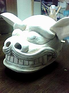 ちょうど13×13×13cmの寸法は偶然でした。ちゃんと口も開いて普通の獅子の縮小版です。手のひらにちょこんと乗る「手乗り獅子」というところでしょうか。これから着色して仕上げます。