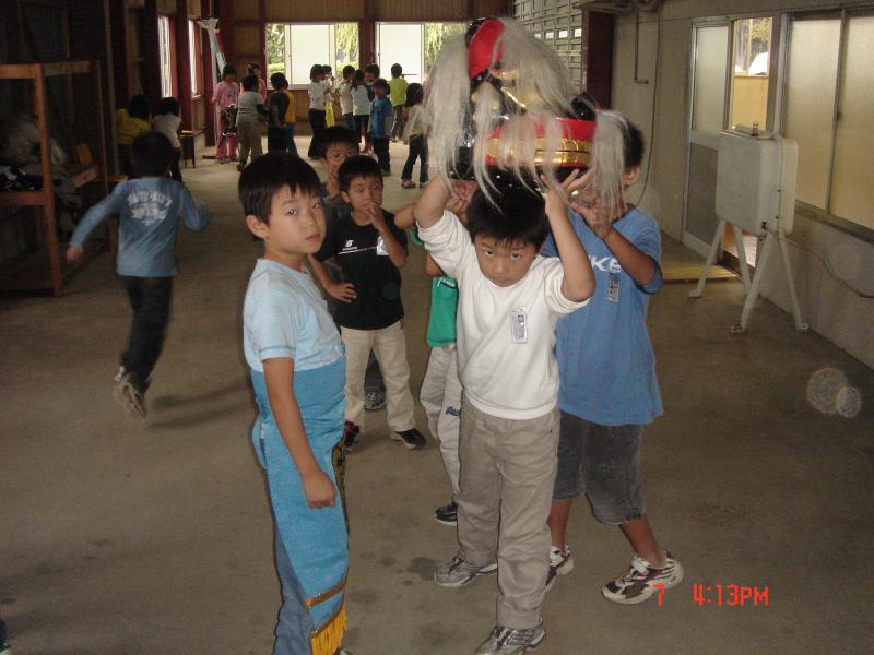 夏休み以来久々の稽古です。ヨサコイ踊りや運動会、自作のダンボールの獅子舞で慰問等の経験を経て、36名の子供達はひとまわり大きく育っていました。今日は獅子頭と副、警護二人、笛と太鼓の役割を決めました。意外な事に警護決定は男女の隔たり無く希望者を募ると、一番元気な男の子と優しそうな女の子が手を挙げてくれたんです!いゃぁー良かった!もしかしてと思ったけどヨクゾ立候補してくれました。やる気満々!化粧回しをつけて稽古を始めました。見てください獅子を振ってる子供の目!お獅子よりおっかない目つきです!