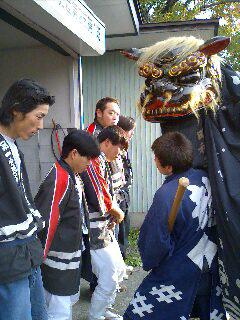 今制作している獅子の白鷹町西高玉の獅子舞を見学にやって来ました。実際に動いている獅子の振り方を見たかったのです。地区の人はある程度まとまった場所に待機してお祓いを受けています。長井の獅子のようにお神酒を飲ませるという仕草が無かったような気がしますが(未確認)。獅子の分も獅子振り達はたくさん飲んでいらっしゃいましたね。
