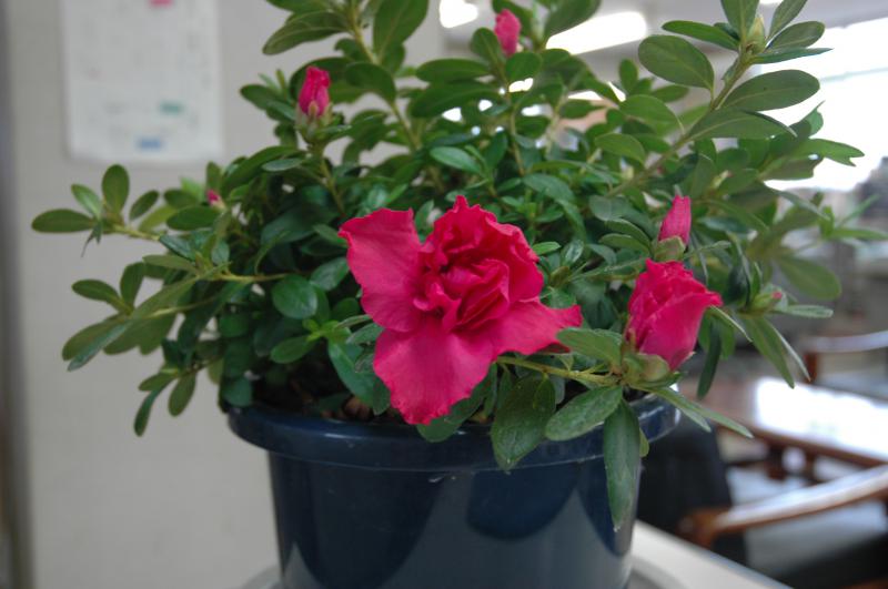 昨年、久留米からいただいた"つつじ"が無事に夏を越し咲き始めています。鉢植で商工観光課のカウンターに飾らせていただいています。