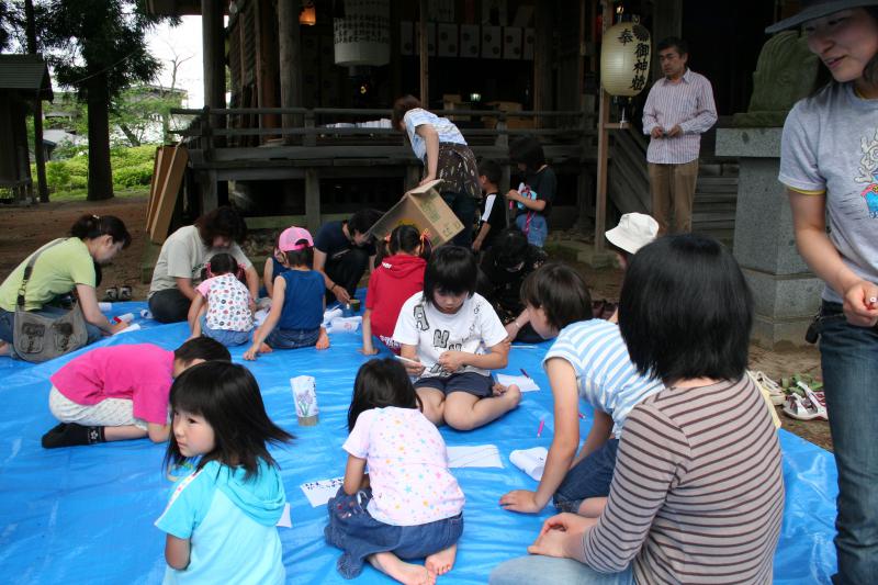 写真は、水辺の灯り回廊で使用するランタンの制作の様子です。子どもたちは、とても楽しそうに和紙に絵を書いていました。