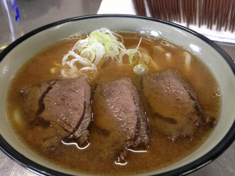 うどんに味噌ラーメンのスープをかけ馬肉のチャーシューを載せました。