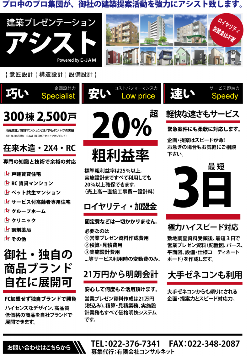 業務支援は「EJAM建築設計事務所」(略称EJAM イージャム・本社:岩手県大船渡市)。弊社コンサルネット(本社:仙台市)が募集代行を務めております。