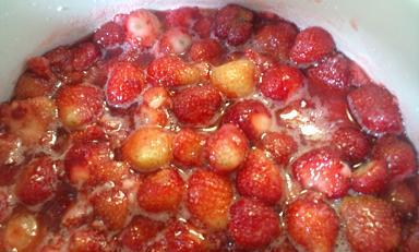 イチゴを洗って、重さをはかって、ヘタをとって、鍋で煮て、