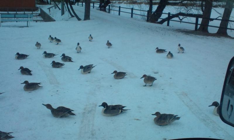 写真は、五郎沼のほとりの道路に出てきた水鳥たちです。