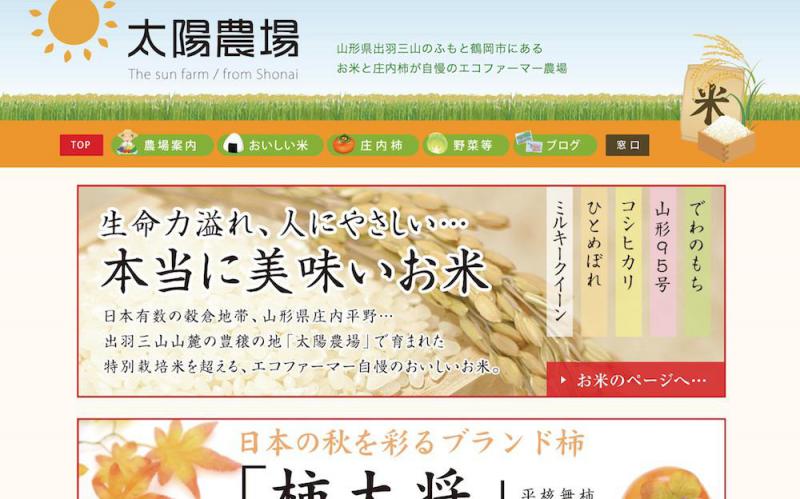 太陽農場http://taiyo-no-nojo.jp/庄内米と庄内柿が自慢のエコファーマー農場「太陽農場」は、独自の「のびのび農法」にて育てた減農薬の庄内米(でわのもち/山形95号/コシヒカリ/ひとめぼれ/シルキークイーン)や、ギフト・贈り物にも人気の「庄内柿」をしっかりと育て販売しています。