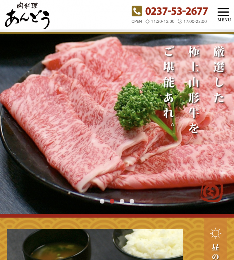 肉料理あんどうhttps://niku-andou.jp/厳選した極上山形牛をご堪能あれ。肉料理あんどう(山形県村山市)では、創業48年・以来厳選した山形牛をリーズナブルな価格でご提供しております。ランチタイムは個室・一人焼肉・女子会・小さいお子様の対応可能。夜の飲み会・宴会・歓送迎会も120席までご用意できますので、おいしい山形牛を囲みながら楽しい時をお過ごし下さい。