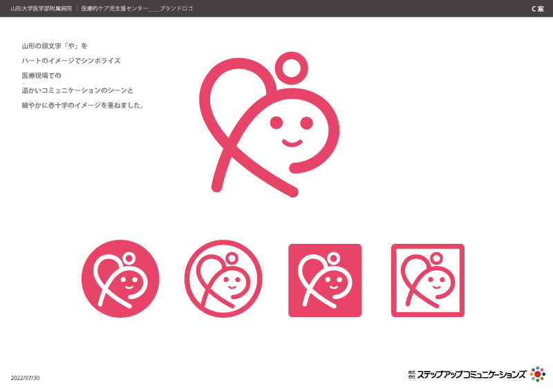 山形県医療的ケア児等支援センター|ブランドロゴ山形の頭文字「や」を ハートのイメージでシンボライズ医療現場での 温かいコミュニケーションのシーンと細やかに赤十字のイメージを重ねました。
