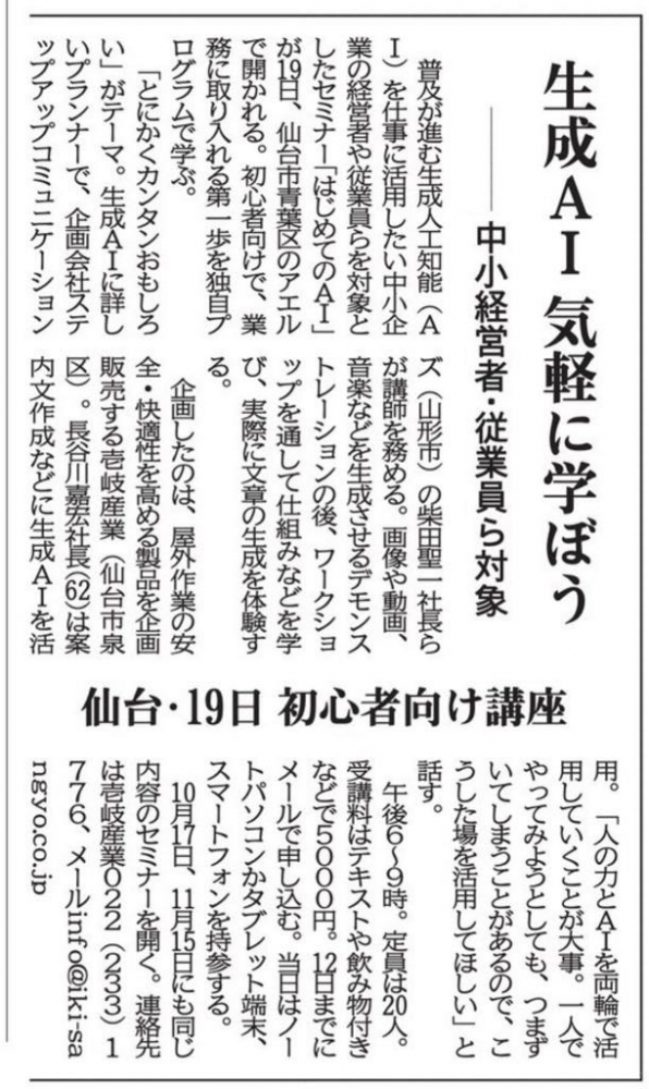 企画したのは、屋外作業の安全・快適性を高める製品を企画販売する壱岐産業(仙台市泉区)。長谷川嘉宏社長(62)は案内文作成などに生成AIを活用。「人の力とAIを両輪で活用していくことが大事。一人でやってみようとしても、つまづいてしまうことがあるので、こうした場を活用してほしい」と話す。