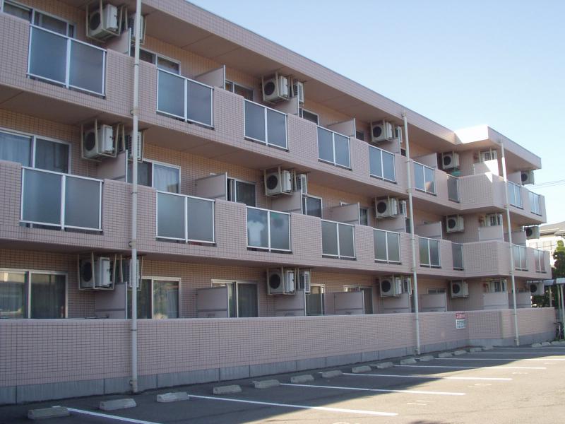 道路沿いにある、ピンク色のマンションです。