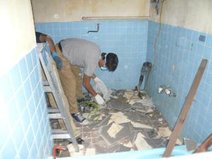 ・ピック≠ニ呼ばれる電動工具と、ハンマーを使い分けながら丁寧に解体していきます。