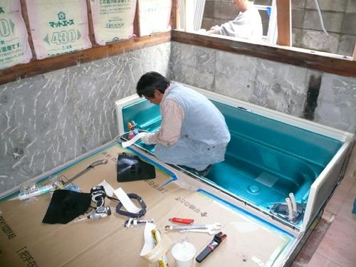 職人さんが取り付けている濃いブルー≠フ部分は、浴槽を保温する効果があります。