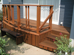 弧を描いて優しい表情のウッドデッキ、階段部分も丁寧に幕板をはり、