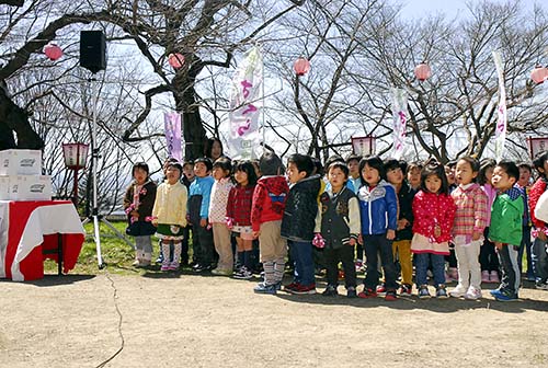 赤湯幼稚園の園児が元気に歌を披露した置賜さくら回廊オープニングセレモニー=南陽市・烏帽子山公園