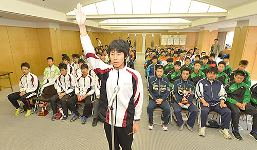 力強く選手宣誓する南陽・東置賜の渡辺清紘主将=酒田市・山新放送庄内会館