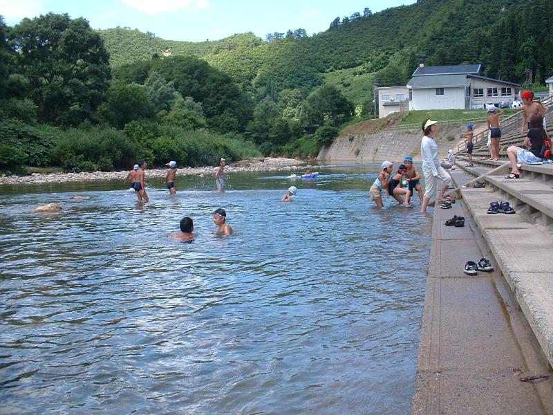 パ−クゴルフ場のそばを流れる清流白川は水遊びをする家族連れで賑わっています。