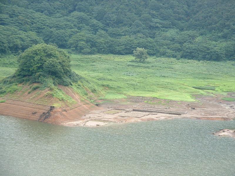白川湖パ-クゴルフ場に向かう途中、白川ダムサイトより上流2qで毎年この時期見られる光景です。今から35年前白川ダムの湖底に沈んだ集落の後です。