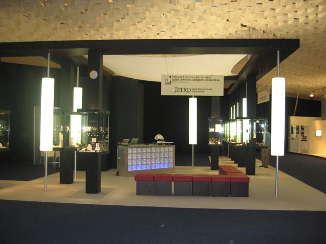 昨年はイタリアのビツェンツァという場所で行われたジュエリーフェアーに、日本貿易振興機構(JETRO)との共催で参加。日本の第一線で活躍するデザイナー32名の作品を展示、参加してまいりました。会場では鏡割りをして日本酒を振舞ったり、日本の伝統工芸を生かしたジュエリーのプレゼンテーションを行ったりと、各国のジュエリーデザイナーとの交流を図りながら、日本のジュエリーデザインのPRをしてまいりました。(写真はイタリアでのジャパンブース)
