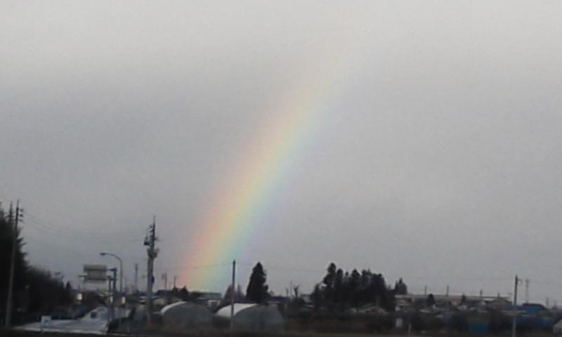 今日は朝から小雨模様でしたが時々薄日が射したりて、昼過ぎに、くっきりと虹が見えました。