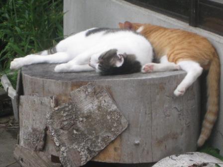 猫たちは、お寺の中が、日常とちょっと違うという雰囲気を察知してか外に出ています。しかし、なかなかいい場所を見つけて、丸太の上とお宮の縁のところでのんびりしております。