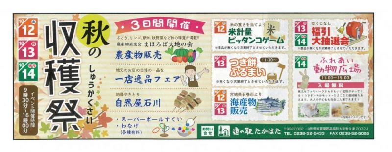 10月12日(土)〜14日(月)に開催を予定しておりました「秋の収穫祭」は、台風19号の接近に伴い、安全を考慮し全日程の開催を中止といたします。