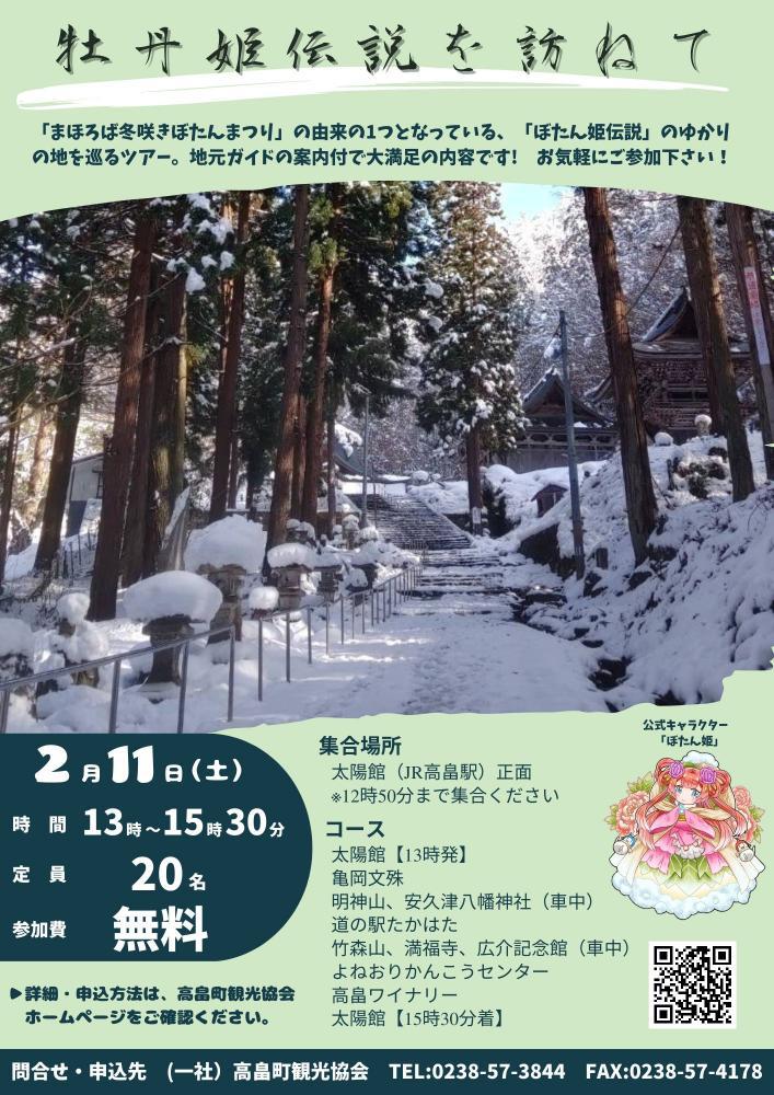 ▼まほろば冬咲きぼたんまつり周遊バス運行情報 「牡丹姫伝説を訪ねて」