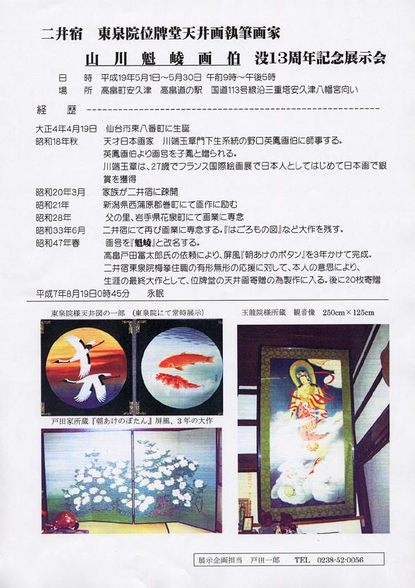 山川魁峻画伯展示会を道の駅たかはたにて開催中です。山川魁峻画伯は、高畠町二井宿地区にある東泉院の位牌堂の天井画を執筆した画家です。