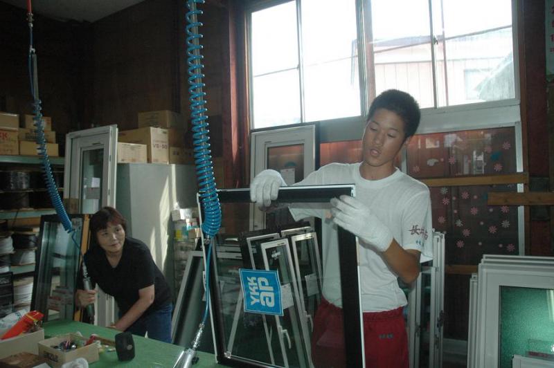 主にガラスなどを作っているそうです。結露しない真空ガラスや割れにくい防犯ガラスがありました。作業台の上で一生懸命働いている顔には汗が光っていました。