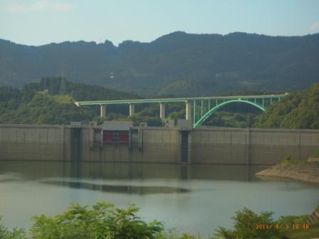 月山湖が見渡せる位置からの眺めです。湖越しに橋が見渡せます。通常は高速道路