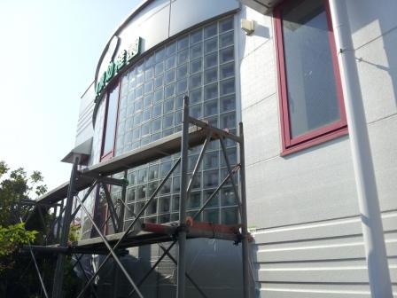 外部足場を設置し、スプレーガンによる遮熱塗装、ガラスブロック本来の透明度を