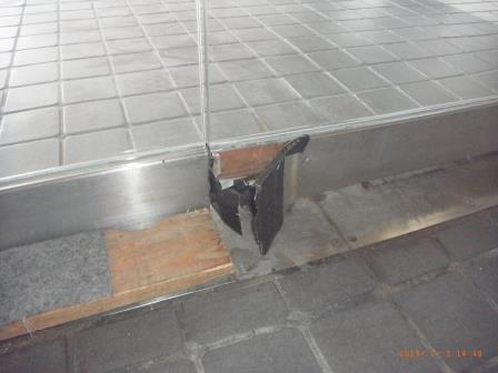 にて吊り込んである、ステンレス製の強化ガラスフレームが、ご覧のようにめくれ