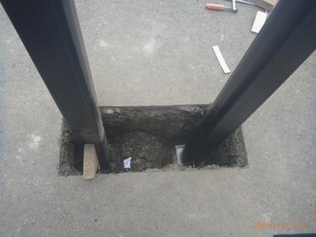 アルミ柱、穴位置を決めて、基礎廻りの工事を行ないます。既存アスファルト部分