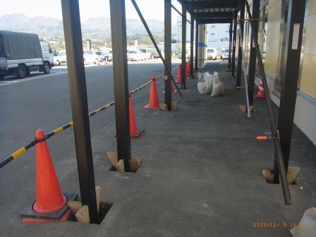 通路の柱位置を確認、各所ピッチを決めて仮固定の作業を行ないます。直線の長さ