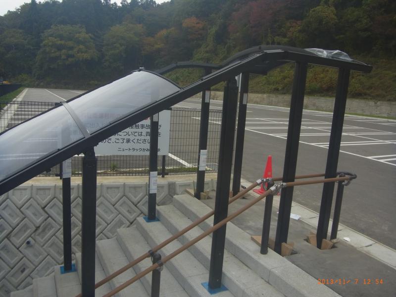通路全体を、階段部分から作業を進めます。傾斜なりに角度が変わるため、ジョイ