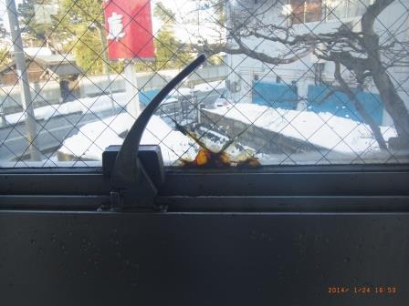突き出し窓の下枠、ガラス溝から結露水が浸透し、網入りガラスの小口からサビが