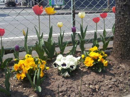 社屋南側の植え込みに、毎年「パンジー」と「チューリップ」の花が咲きますが、