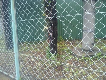 ネットフェンスの中間部に穴が開いています。「全面張り替え」がベターなのですが