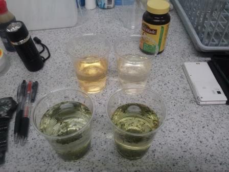 コップに「お茶の葉」を入れて、水を注ぎます。よく撹拌しながら、しばらく様子を