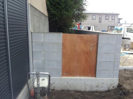 周囲をブロック塀で囲い、開口部を設けます。左右にアルミ柱を立て、蝶番吊りにて