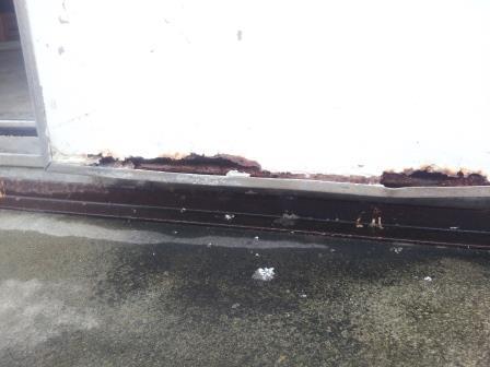 永年の間、風雨に晒され、スチール製ドアの下部フレームが腐食、錆び付いてしまい