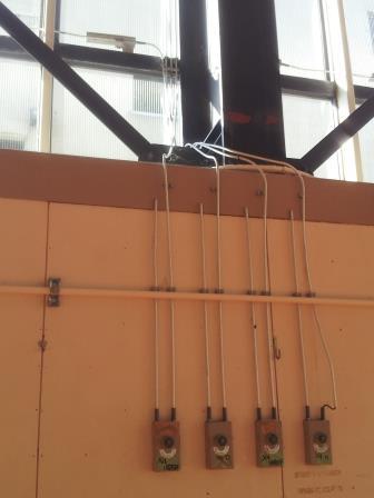 排煙窓の操作用、オペレーターのハンドルボックスが、壁面にずらり並んでいます。