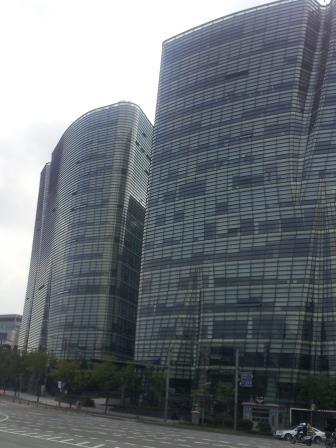 筋向いの方から眺めると、やはり「X字型」に鋭く抉られた形状のカーテンウォール