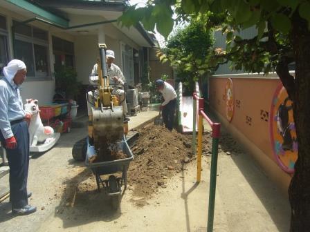 園児の遊び場、エントランスアプローチ部分の改修工事に取り掛かりました。遊具
