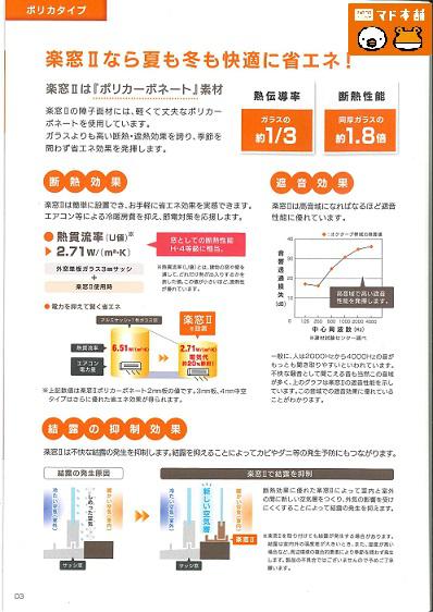 断熱効果*熱貫流率(U値)2.71W/m2・K*➡窓としての断熱性能H−4等級に相当します('◇')ゞ加えて、「楽窓U」は、遮音効果、不快な結露抑制効果にも優れた性能値を備えています(^O^)/
