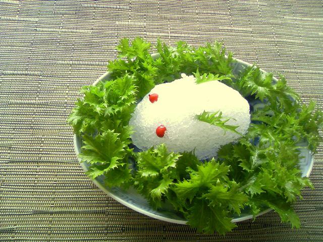 ※画像は、タミキョン畑のワサビ菜と、庭の南天の実で作った雪うさぎです