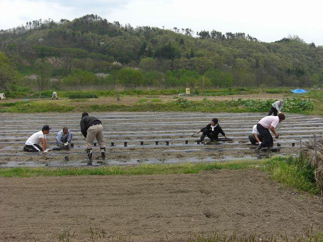 「穴あけ班〜。ちゃんと開けげねど植えらんにぇ〜!!」