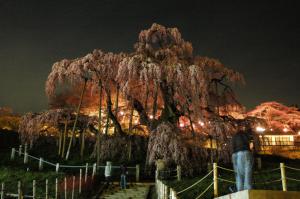待ちに待った桜のシーズン到来♪ 私の地元、三春町にも春が来ました。 今日は少し、仕事を早めに切り上げ、 滝桜をまだ見たことの無い、奇特な友人を連れ、夜桜めぐりです。 まずは建福寺の桜 これは三春町ではなく、郡山市に入るのですが、 実家のすぐ裏にあるので、特別に参加です。 続いて、三春町役場の上、歴史民俗資料館の隣にある 桜谷枝垂れ桜 同敷地内の桜 そこから滝桜に向かう途中にある 常楽院桜 隣に写っているお宅から、その大きさをはかって下さい。 まるで覆い被さるように、そびえ立ってます。 トリは冒頭の滝桜! 当初のライトアップ期間が過ぎ、開花の遅れで、 再度、週末にライトアップされるようです。 (シャッタースピードを遅くして、三脚を立てて撮影してま〜す) シーズンの滝桜周辺の渋滞・混雑を考えると、 車で近づくのは大変危険な場所ですが、 街の至るところに、見応えのある桜が点在しておりますので、 一日コースでゆっくり歩って廻られるのも、楽しいと思います。 そして何より、三春の人は、三春が大好き♪ なので、 そこかしこで、その現場に遭遇できることでしょう。 さて、週末は早起きして、昼桜めぐりといたしますか =3 |