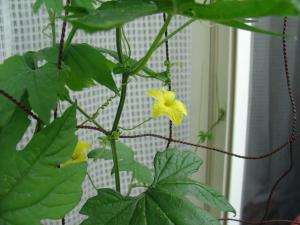 先日、ゴーヤハウスの記事に少しだけ書きましたが、 今年はアパートでゴーヤを育てています。 理由は壁面緑化と食材です(笑) 当初、害虫に押され気味だった食材達も、 今では徐々に立派に育っております。 こんなに小さいのに、一生懸命ゴーヤになろうとしている その姿が可愛らしい。 徐々に徐々に伸びて 行先がなくなってしまいました。 とぐろを巻いて更に伸びます。 少し大きい実もなるようになりました。 でもこれ以上大きくならないの(涙) ゴーヤを収獲するまでには、なかなか至りませんが、 葉っぱ越しのお外は、充分涼しげな景色をもたらしてくれてます。 |