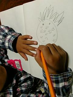 なんて思い出したりしてます。最近のP君の`お絵かき‘をみてると、ドラゴンボールに出てくる、‘スーパーサイアジン‘とかいう人をよく書いてます。